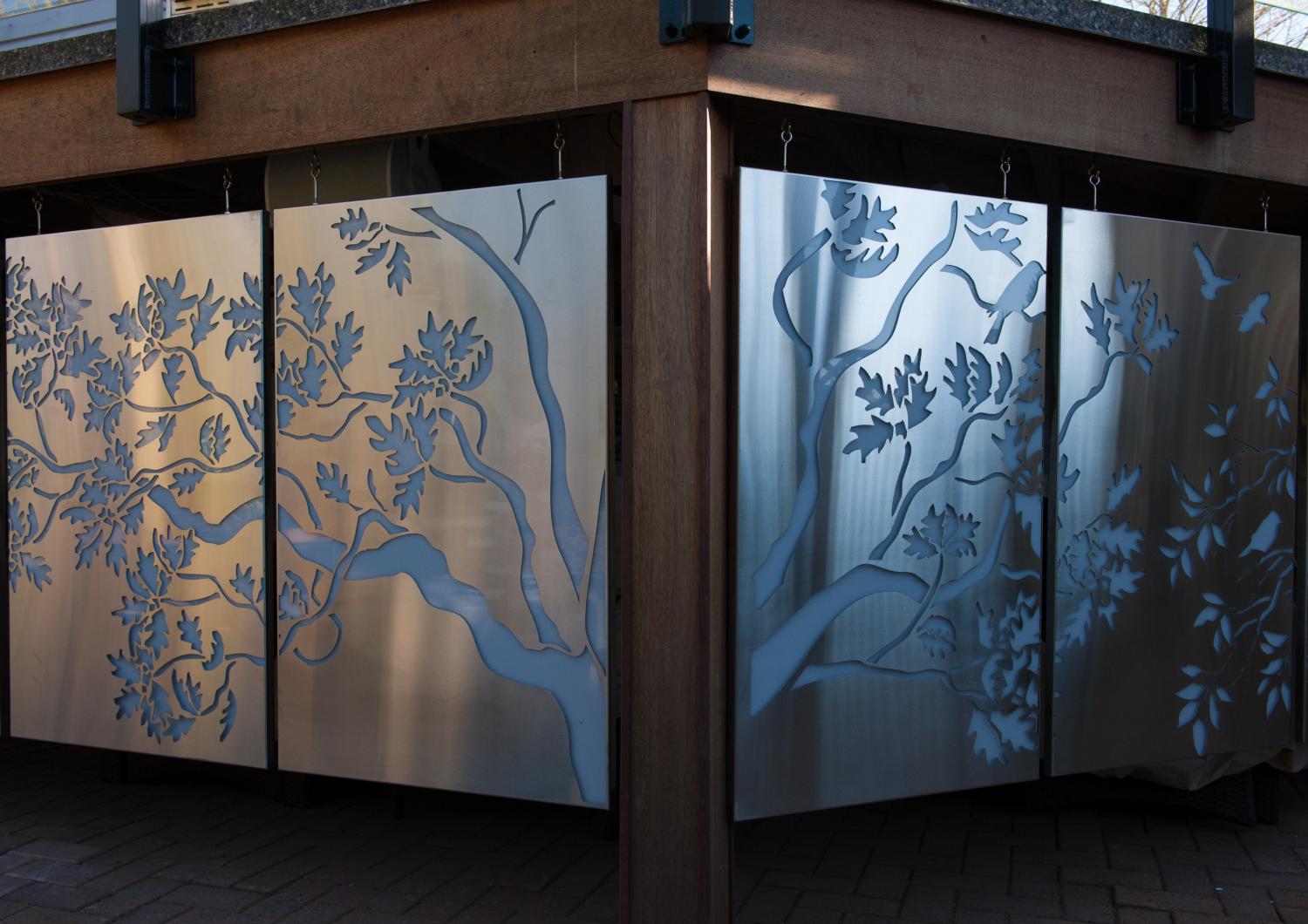 This is one example of a homowner request to have some unique architectural hanging outdoor panels cut. These panels were cut from an image supplied to us and then cut on our WaterJet. We are able to cut almost any design you can bring us. We are able to fabricate banisters, railings, signage, gates, etc. You name it. We have designers and engineers on board to assist in your custom project.